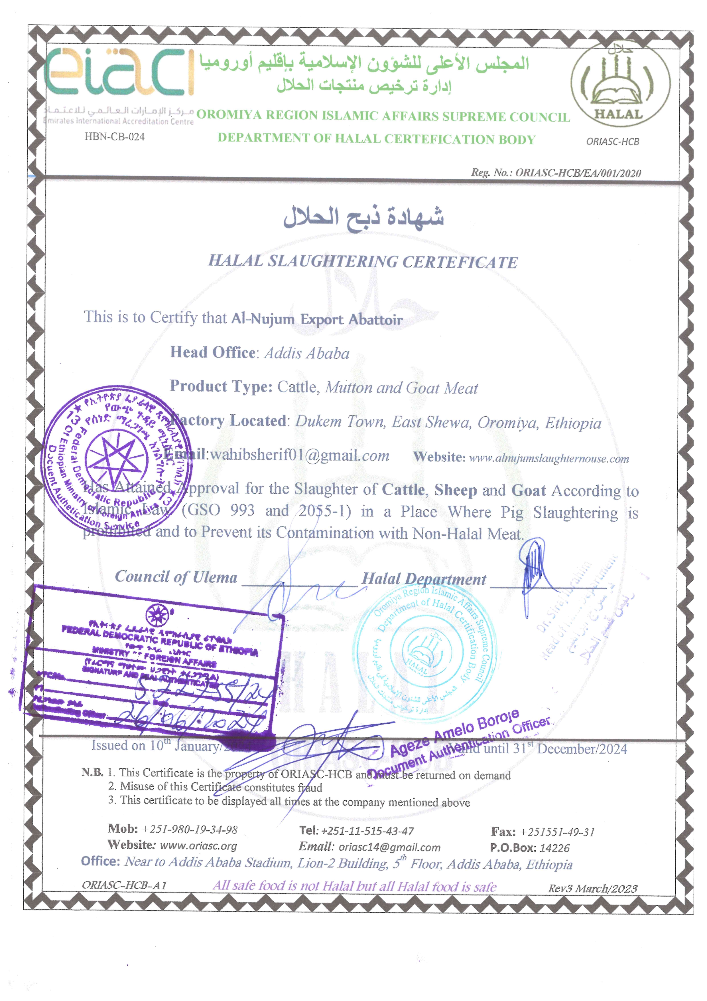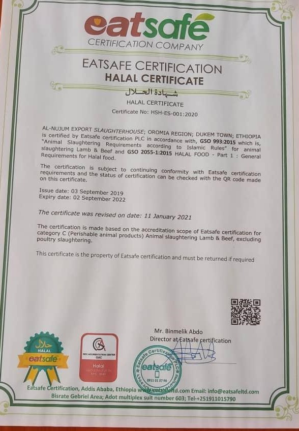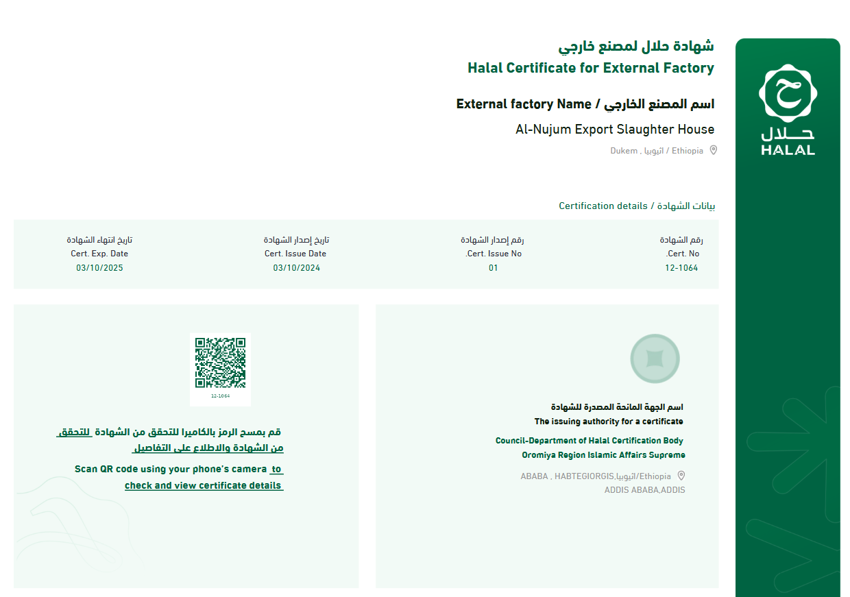 Certified by Oromia Region Isalmic Affairs SupermCounsil Department of Halal Certification body.