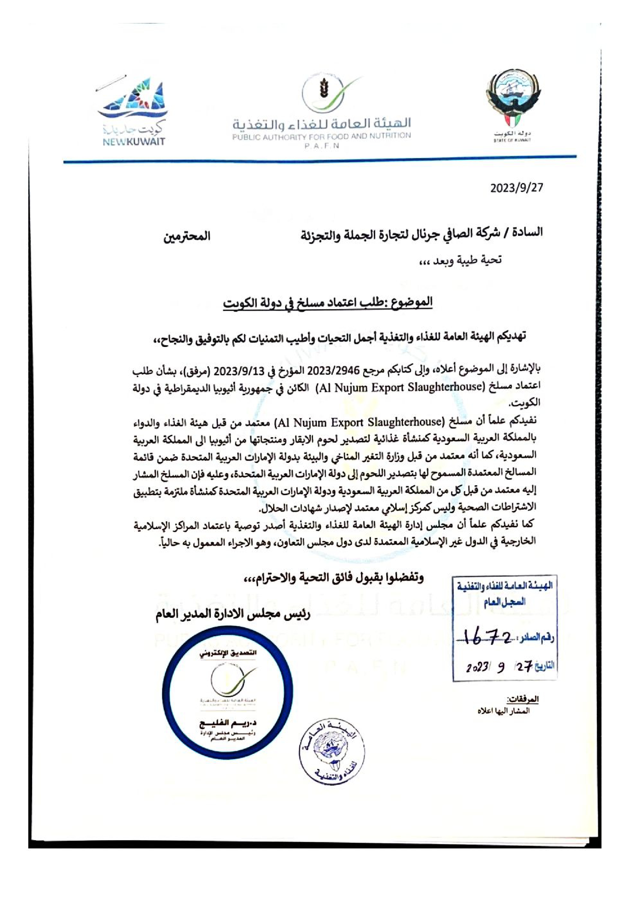 Approval of a Slaughterhouse in the state of Kuwait